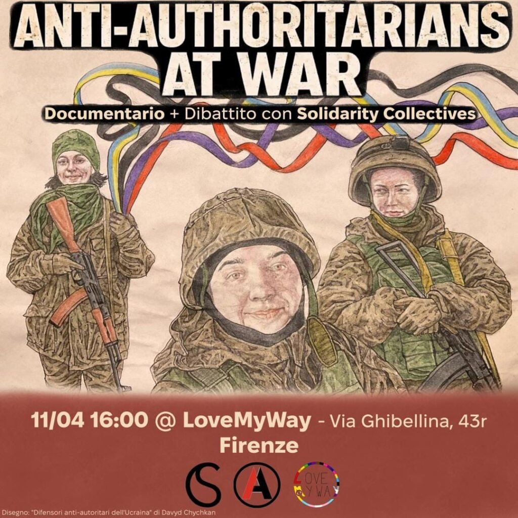 Sabato 11 Aprile alle 16:00 nella nostra sede avremo il piacere di proiettare Anti-Authoritarians at War, una serie di interviste che raccontano la partecipazione di militanti anarchicə e anti-autoritariə alla resistenza Ucraina dopo l’invasione russa. Il documentario segue l’esperienza di combattenti e volontariə che hanno scelto di organizzarsi ed unirsi alla lotta, mostrando sia la dimensione militare sia quella politica e mutualistica della resistenza.